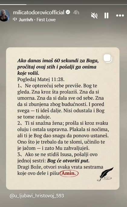 Ne opterećuj sebe previše. Bog te gleda. Zna kroz šta prolaziš. Zna da si umorna. Zna da si dala sve od sebe. Zna da si zbunjena zbog budućnosti. I pored svega, ti ideš dalje. Nisi odustala i Bog se tome raduje. Ti si snažna žena, prošla si kroz svaku oluju i ostala uspravna. Plakala si noćima, ali ti je Bog dao snagu da ponovo ustaneš. Ono što je trebalo da te slomi, učinilo te je jačom i zato Mu zahvaljuješ‘ – stajalo je u objavi Milice Todorović ove reči, sa kojim se očigledno poistovetila.