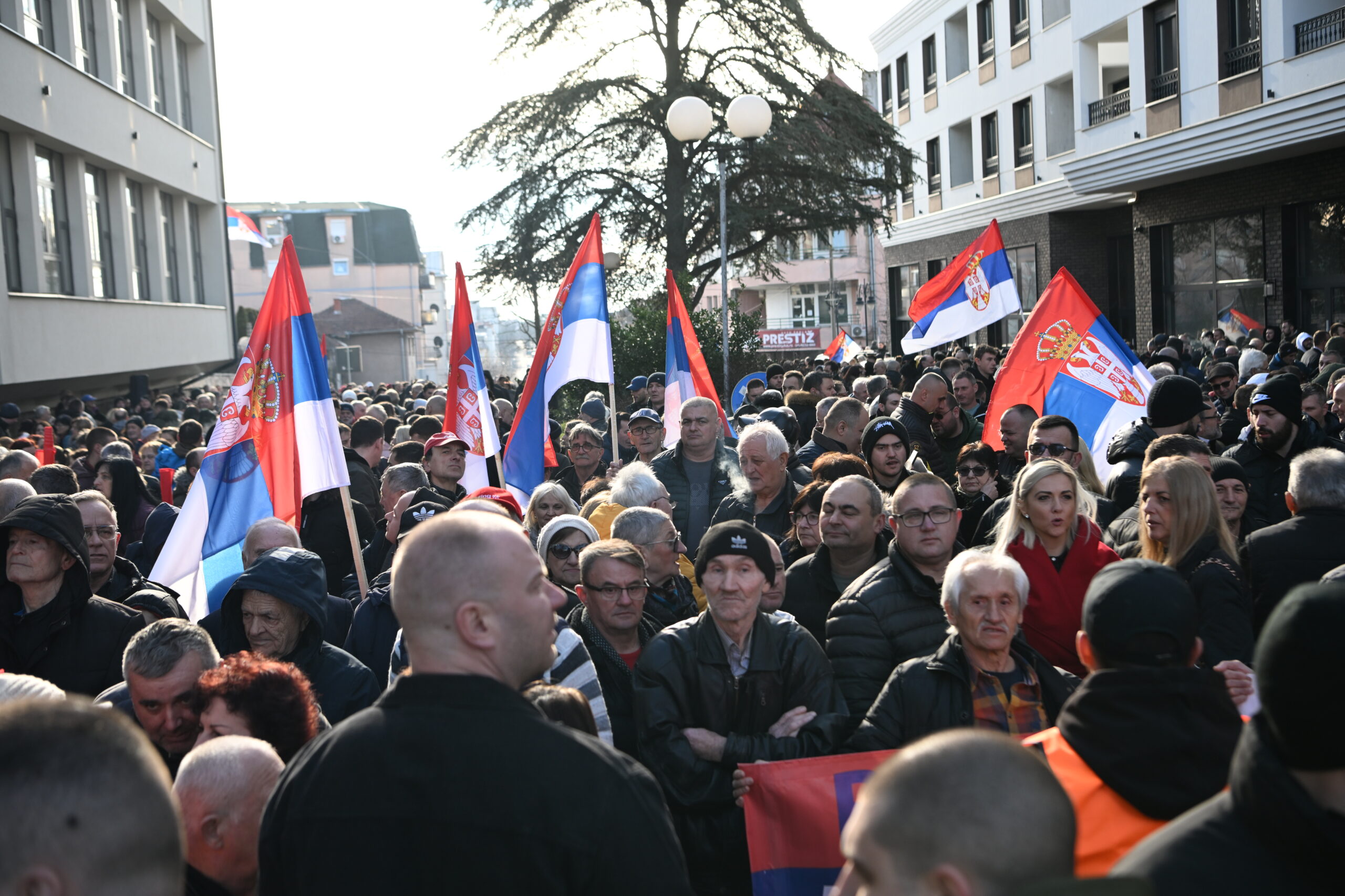 Predsednika Vučića je ispred gimnazije dočekao veliki broj građana sa zastavama Srbije.